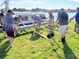 With the first two deliveries of materials being mainly telegraph poles, timber and paving slabs for the foundations, the team really need help and support from club members with moving these heavy and bulky items. The only way to transport the materials to the moorings is by river, so we need help with lifting and shifting every item from the staithe via the safety boats to the moorings.
