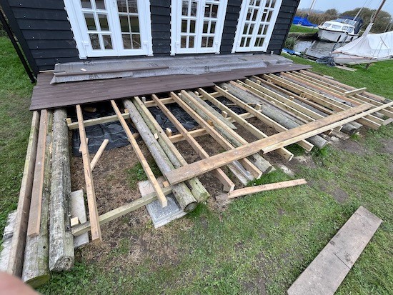 A cold northerly wind, with wintery showers made it not much fun working outside today. Decking surface all but finished but lots still to do on the front step up onto the decking and finishing around the edges. Amazon let us down with Cupranol promised for yesterday so no more work on the flooring today. Hope to resume that on Thursday.