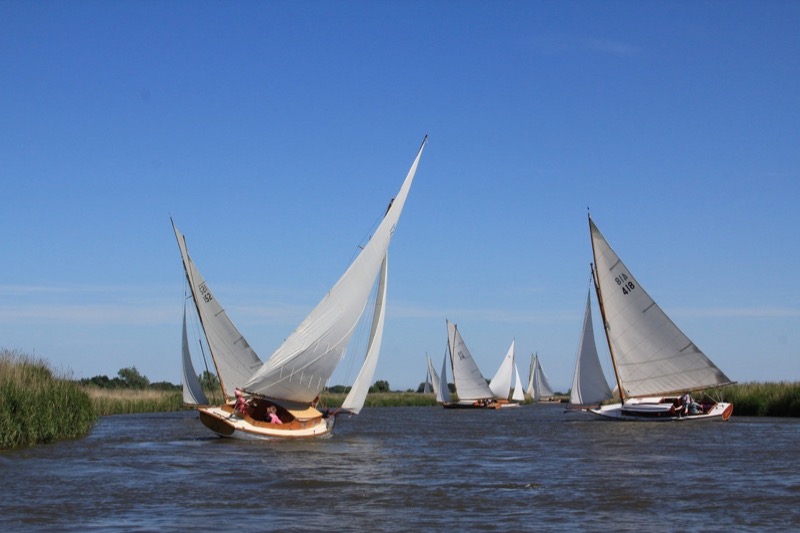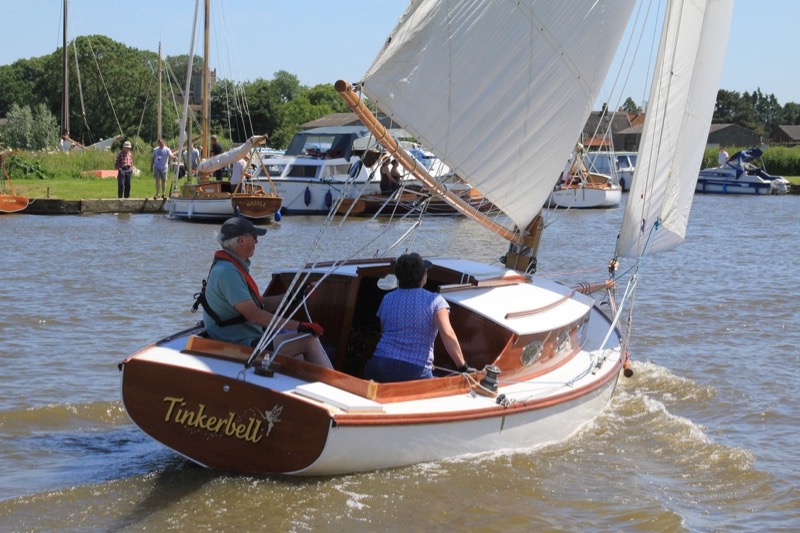 After a lunch break where competitors discussed the racing and caught up on news, the third race was a traditional “round the cans” race, starting and finishing at Thurne Mouth. Good to see John Aves who assisted Tom at the start and finish of this race. The two safety boats set off from the Club site to the start point, only for one of them to have to return as Dr Tom had forgotten his dogs! A second trip back was also made to collect the forgotten white board. Check lists were discussed! Again, 14 boats started and finished with the first three places being Breeze, Mystery and Catspaw.