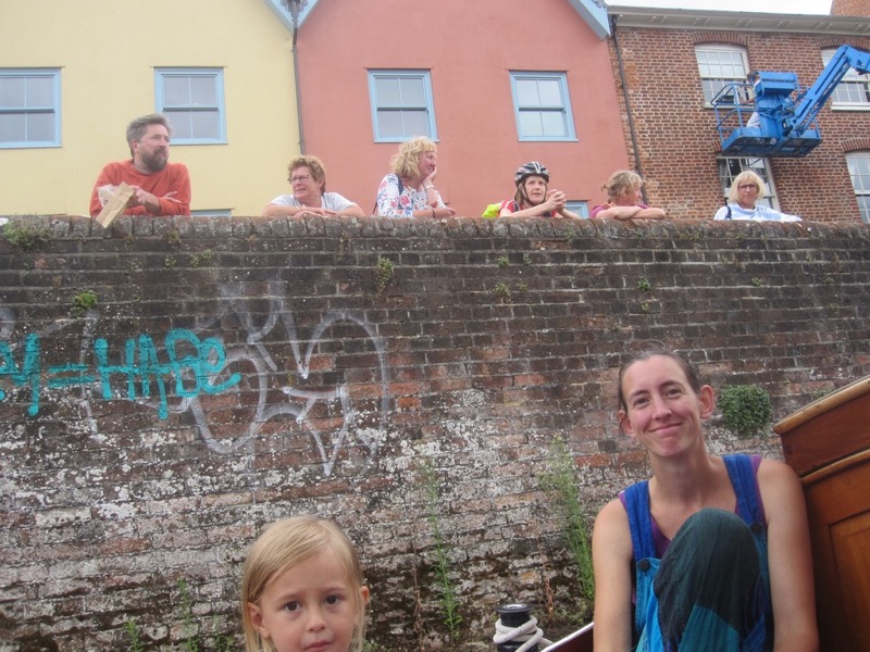 Shopping done, we made for the Ribs of Beef and fortified ourselves with ale while the OOD, Colin Chett, laid the course - 2 buoys (one was port and one starboard apparently, but no-one heeded that) between Fye Bridge and Whitefriars Bridge, five laps to be completed by 3.30pm, self timed. Keen as ever, Dr. Tom headed off first on Mystery and was going great guns when Sun Glory II joined in, followed by Breeze and Catspaw. Moondaisy had a sniff but wisely retired to take photos. It all got a bit interesting, and the good burghers of Norwich were suitably impressed, quite a crowd gathering to see the fun. The course was shortened to ‘do as few laps as you like’, and an average lap time was taken, the eventual winner, and very deserved, was Dr. Tom. The trophy will grace his new house in Thurne beautifully.